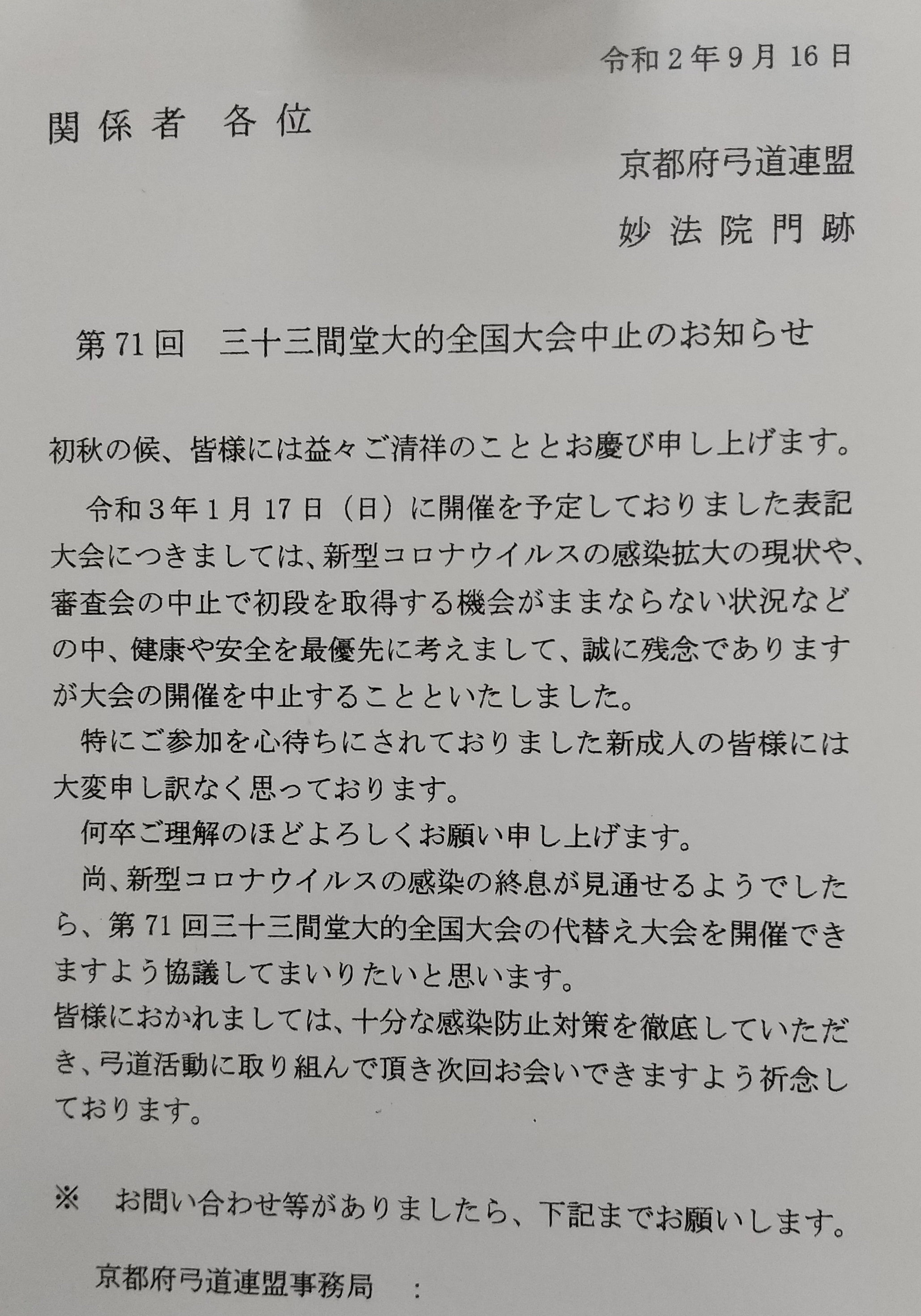 令和3年1月17日に開催を予定していた表記大会の中止のお知らせがありました。 なお、新型コロナウィルスの感染の終息が見通せるようになりましたら、代替大会開催の協議をしたいとの事です。